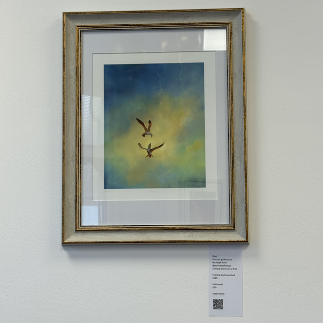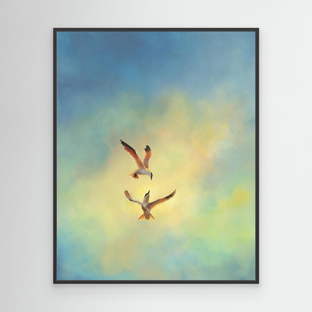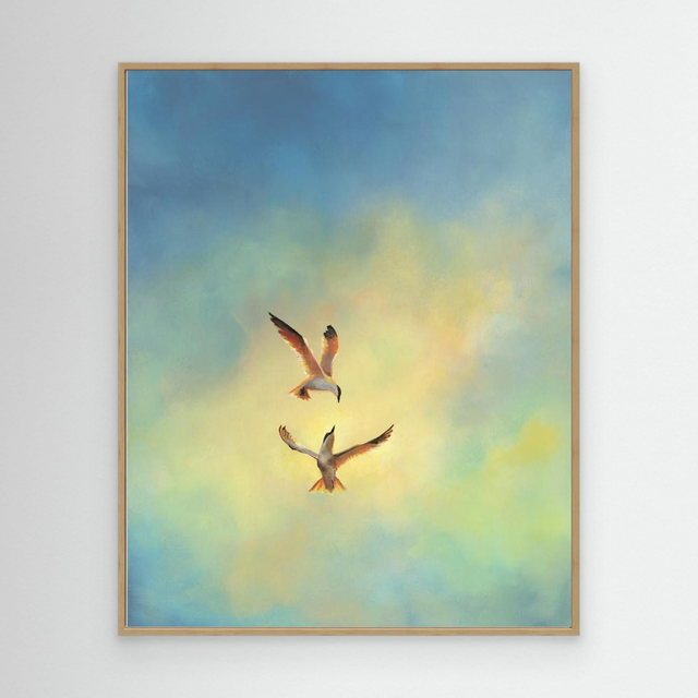 Duet portrays two elegant sandwich terns suspended in the golden glow of a summer sky. Facing one another in mid-air, their wings outstretched, they appear to be in silent conversation, a moment of connection that speaks without words. Set against soft blue and radiant light, the painting celebrates harmony, companionship, and the poetry of flight.