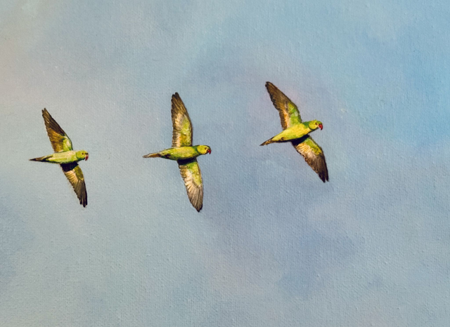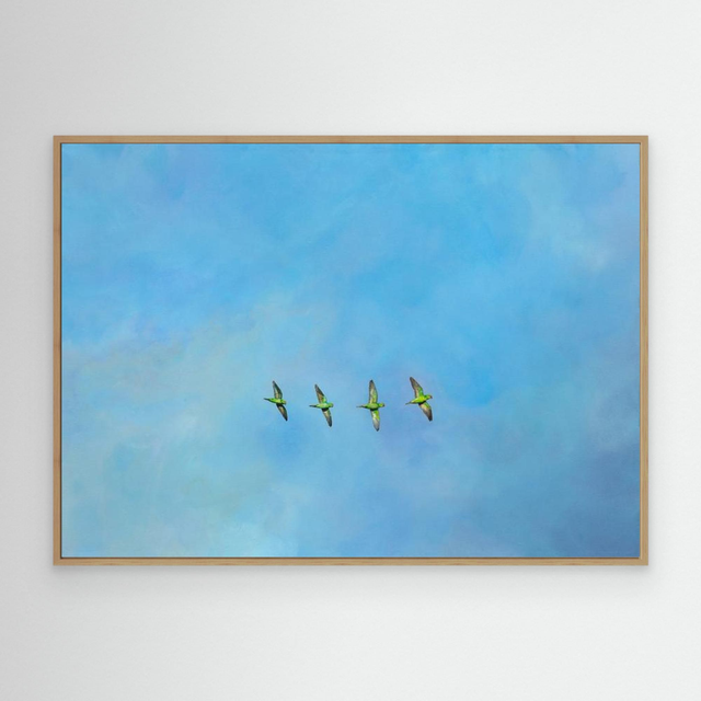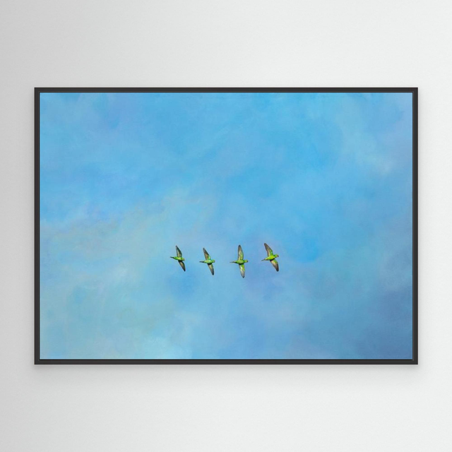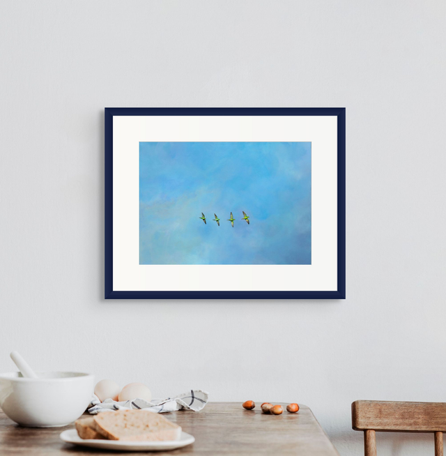 Escape Artists features four rose-ringed parakeets, with glittering emerald detail on Kentish skies. This piece is dedicated to those who acknowledge that human interference cannot overpower nature and these sociable, bright birds decorate the skies and your home, symbolising freedom and breaking the mould.
