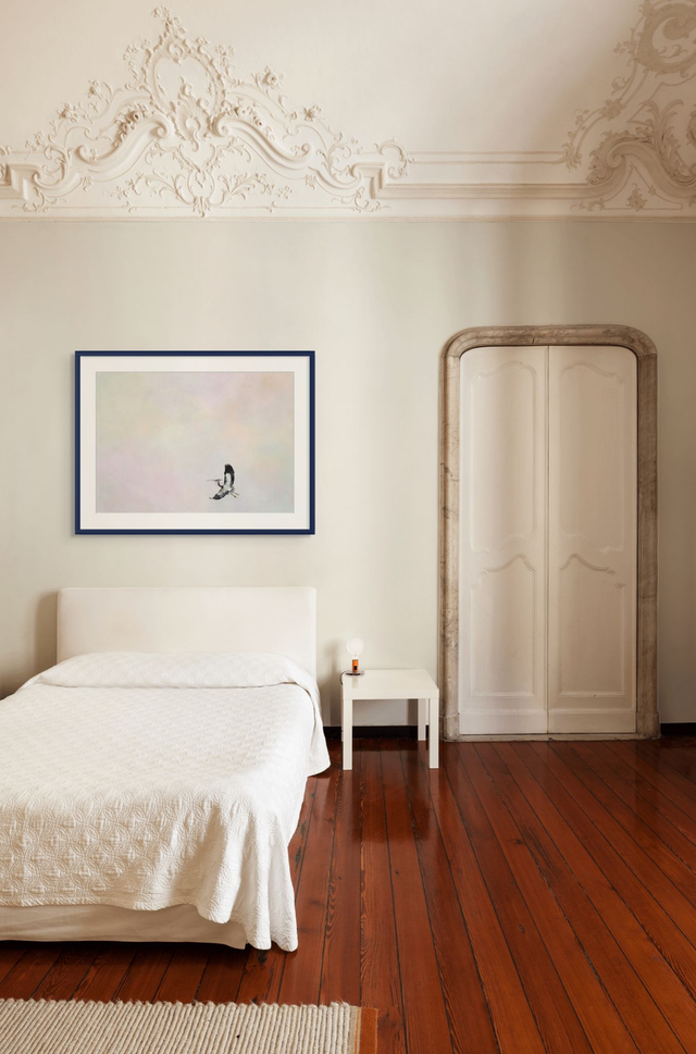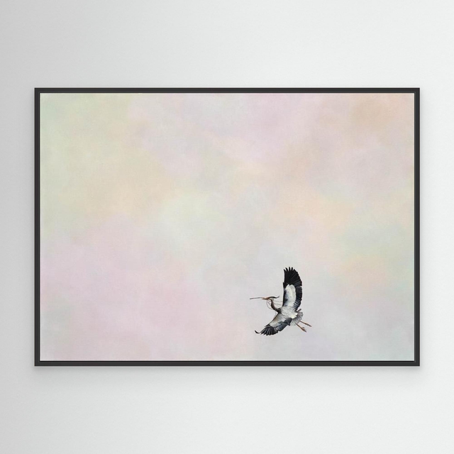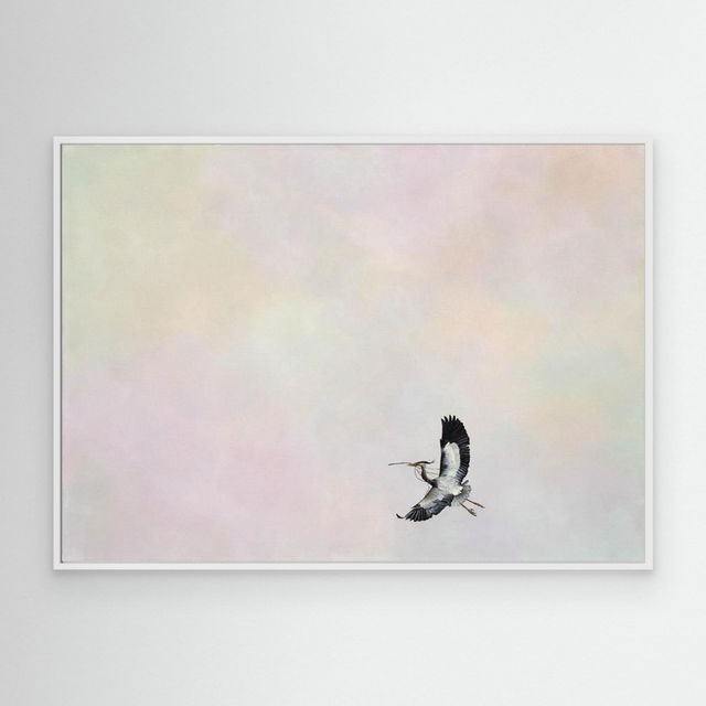 A lone heron takes flight against a moody sky, a delicate twig clasped in its beak. Subtle hues of peach, yellow, pink, purple, and green weave through the background, expertly blended in thin layers of acrylic to create depth and atmosphere. This piece captures a moment of quiet determination—a symbol of hope, resilience, and new beginnings. Dedicated to anyone who has ever had to bravely start again, it serves as a reminder that every journey forward begins with a single, courageous step.