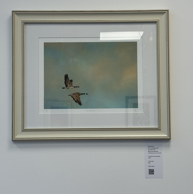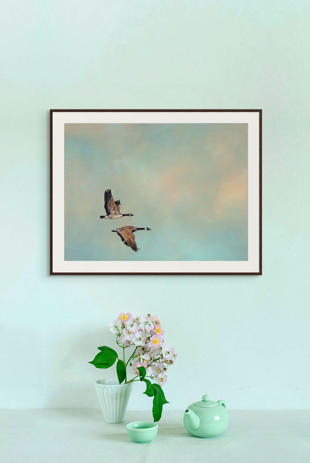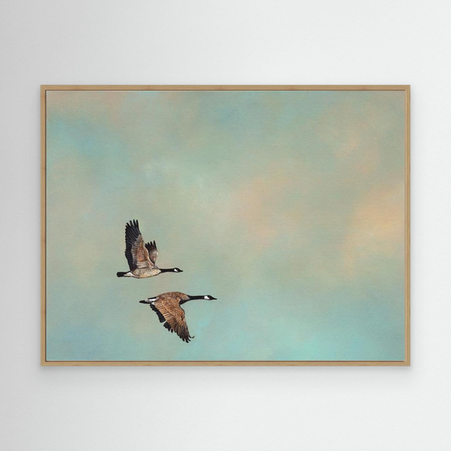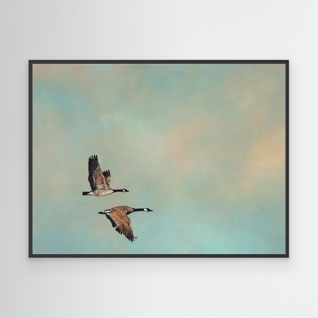 Set against the golden clouds that mark the end of day, two Canadian geese fly together. The Oxford English Dictionary defines sacrosanct as something too important or valuable to be interfered with. This speaks to the sanctity of migration and the invisible bond between two souls. In a V formation, the lead bird creates an air current that eases the flight for those behind—but it's harder work for the leader, so they take turns. If a bird becomes too tired to go on, it will land—and another will follow to stay until it recovers. That quiet companionship and mutual support is honoured, steadfast and unwavering.